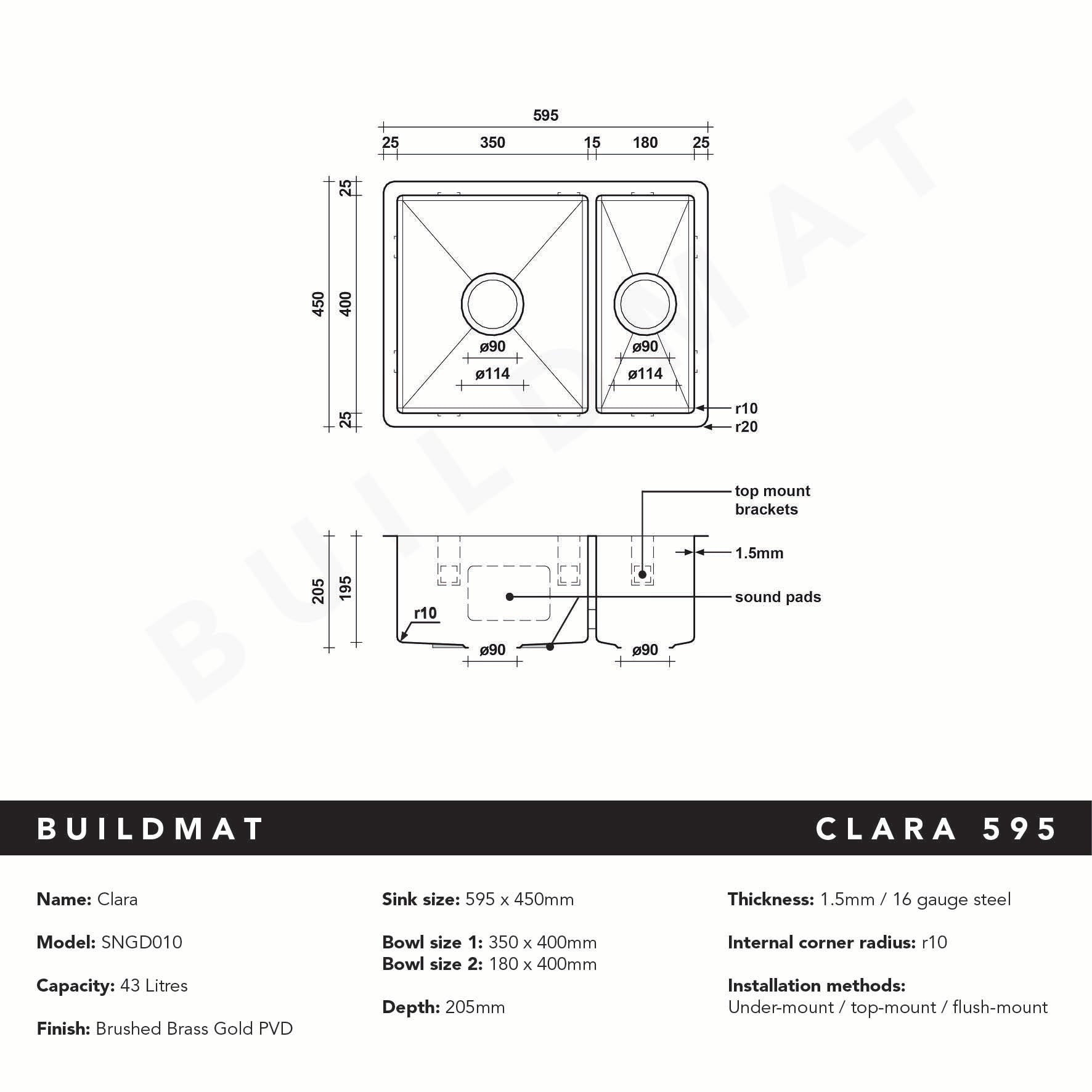 The Clara 595 sink is the perfect choice for a space-saving kitchen solution. This double bowl sink provides a larger main bowl (350x400mm) and a convenient mini bowl (180x400mm) which is perfect for smaller items. This compact size sink is suitable for a 600mm cabinet and is available in three different finishes (Brushed Stainless Steel, Brushed Gunmetal, Brushed Brass Gold) to match your style.