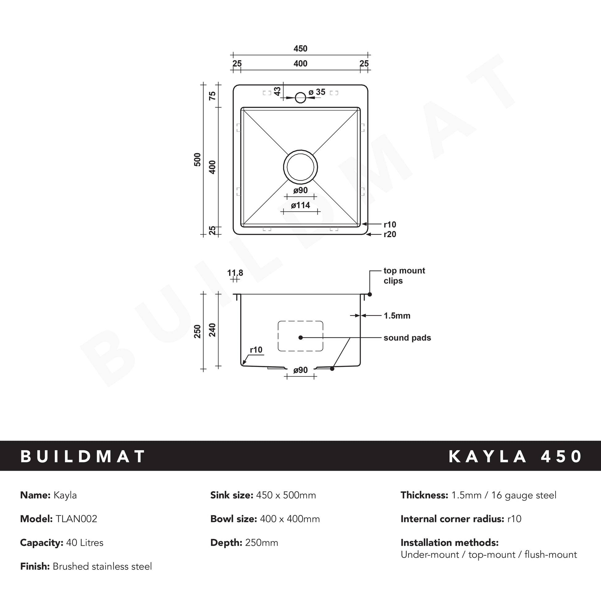 Whether you're limited on bench space or just need a square and compact sink, the Kayla 450 Tap Landing sink is the perfect choice. It offers an impressive 250mm depth and its size makes it ideal for tight kitchen or laundry spaces such as in studios and caravans. No doubt this highly versatile sink is sure to meet all your needs!