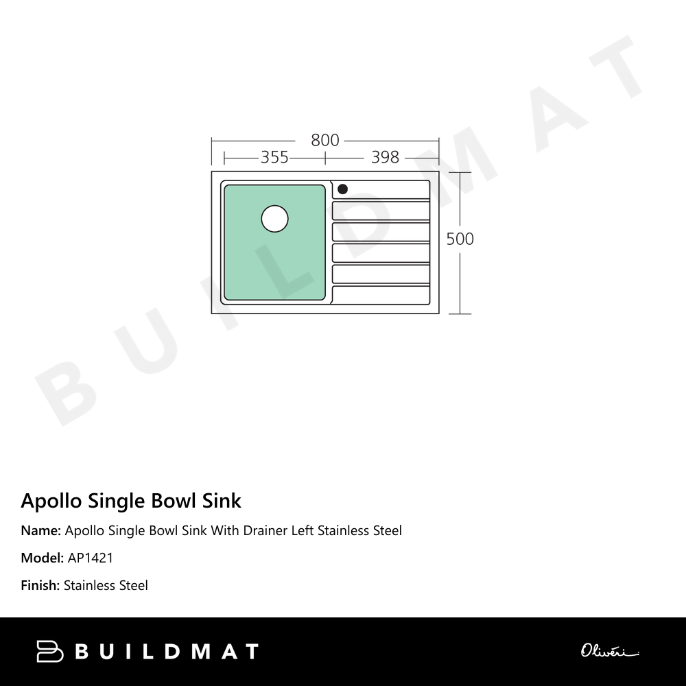 Apollo Single Bowl Sink With Drainer Left Stainless Steel