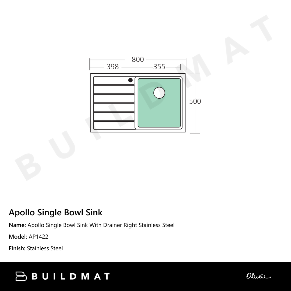 Apollo Single Bowl Sink With Drainer Right Stainless Steel