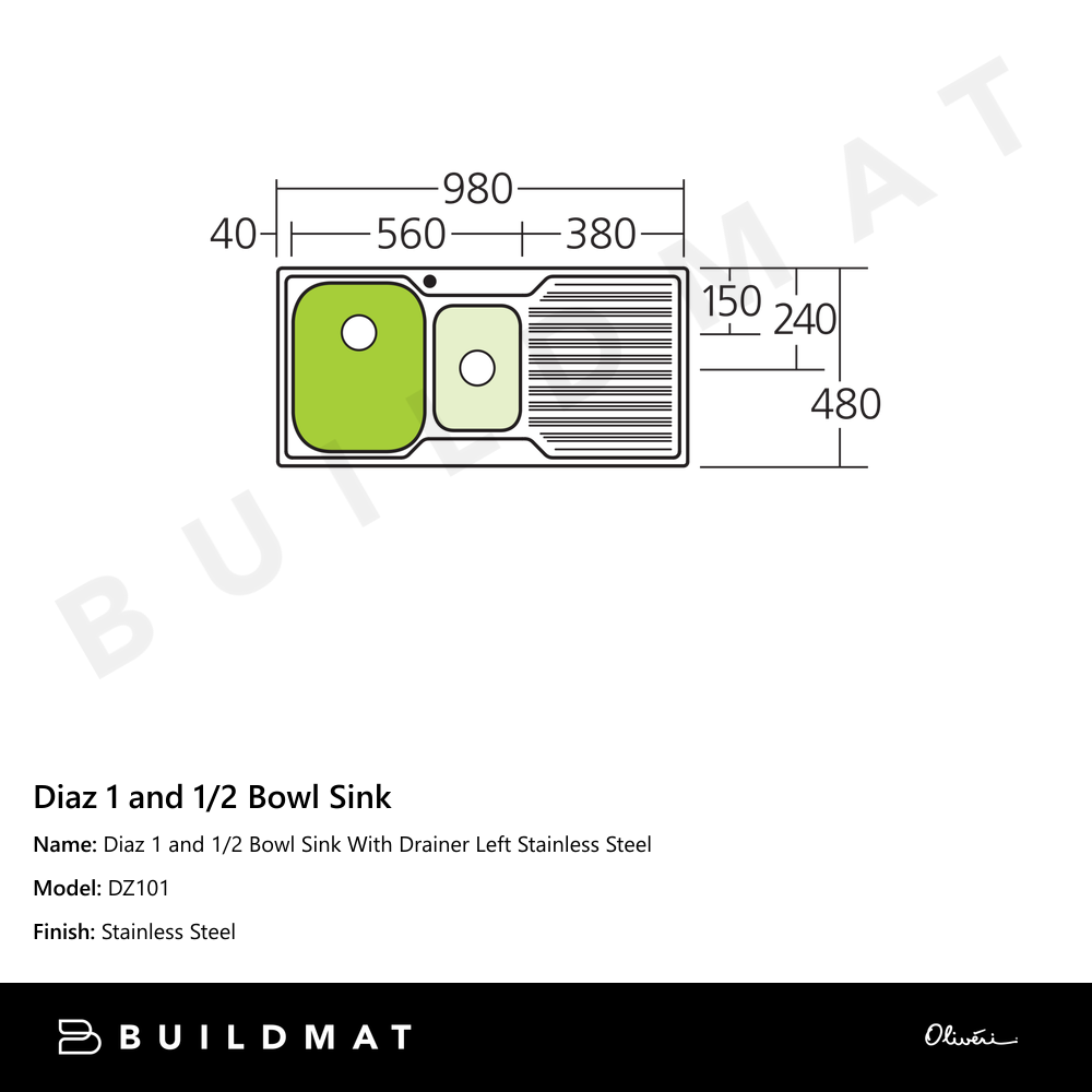 Diaz 1 And 1/2 Bowl Sink With Drainer Left Stainless Steel