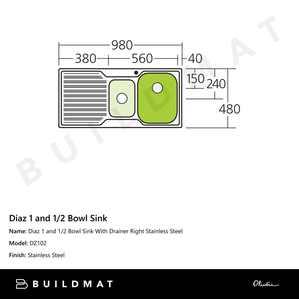 Diaz 1 And 1/2 Bowl Sink With Drainer Right Stainless Steel