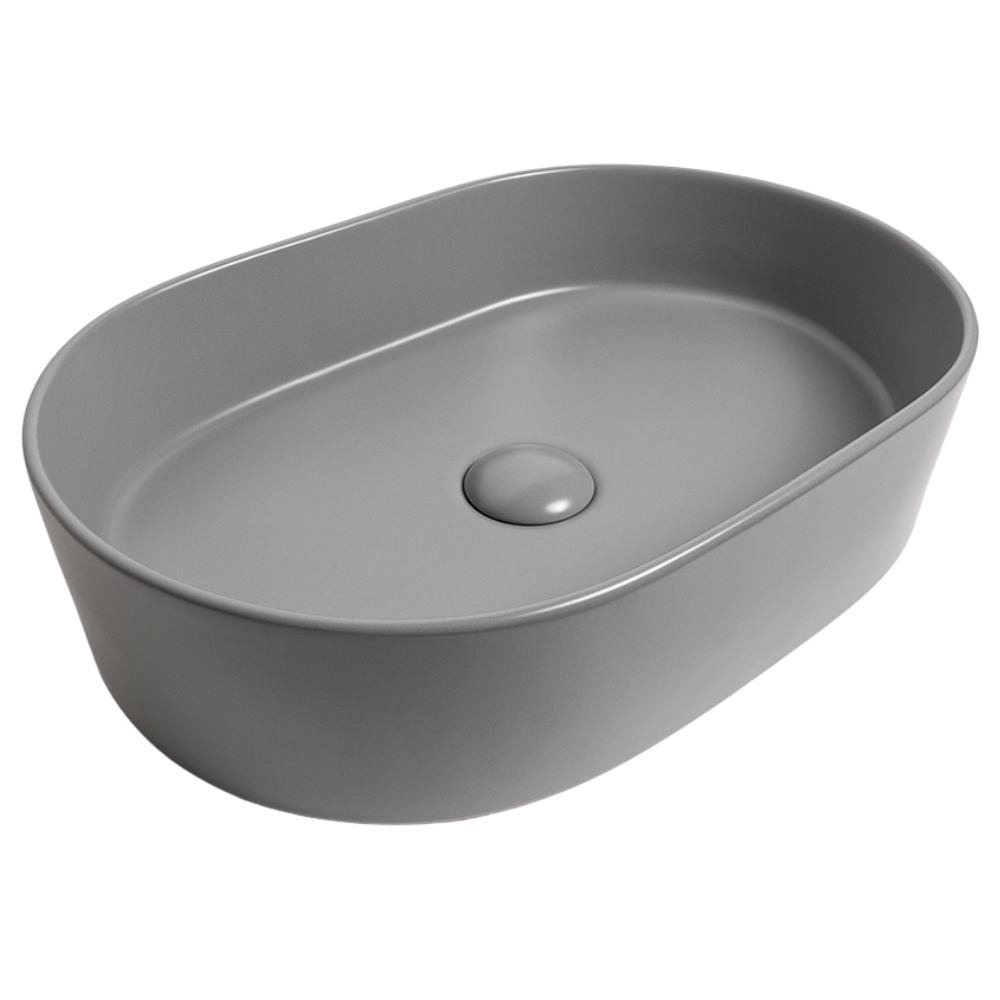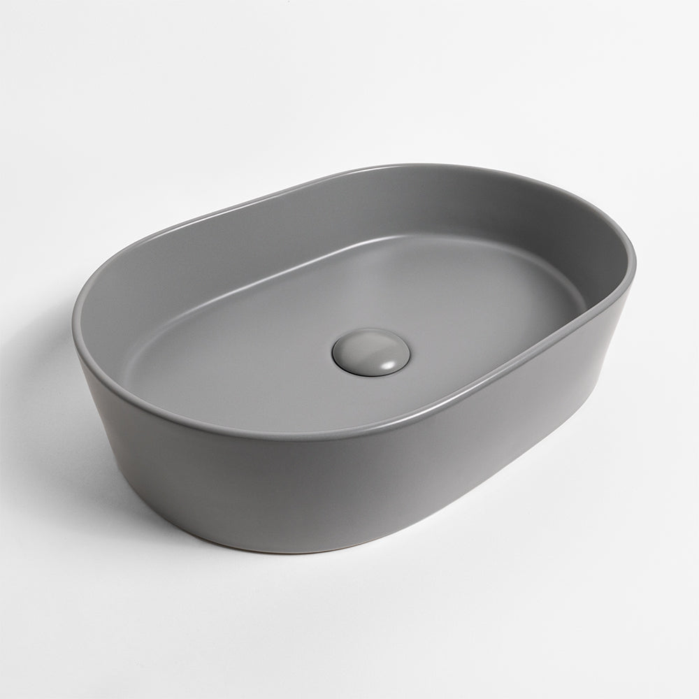 Constructed from high-quality ceramic, ensuring durability and longevity and easy maintenance, the Petra Pill basin's matte grey finish creates a striking focal point, making it an ideal centrepiece for any contemporary or classic bathroom. Suitable for both countertop and wall-mounted tapware setups, providing flexibility for your bathroom design.